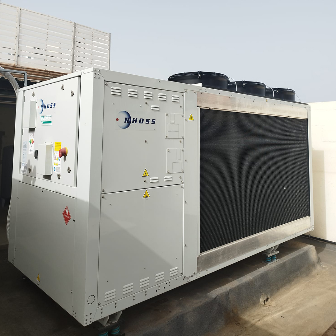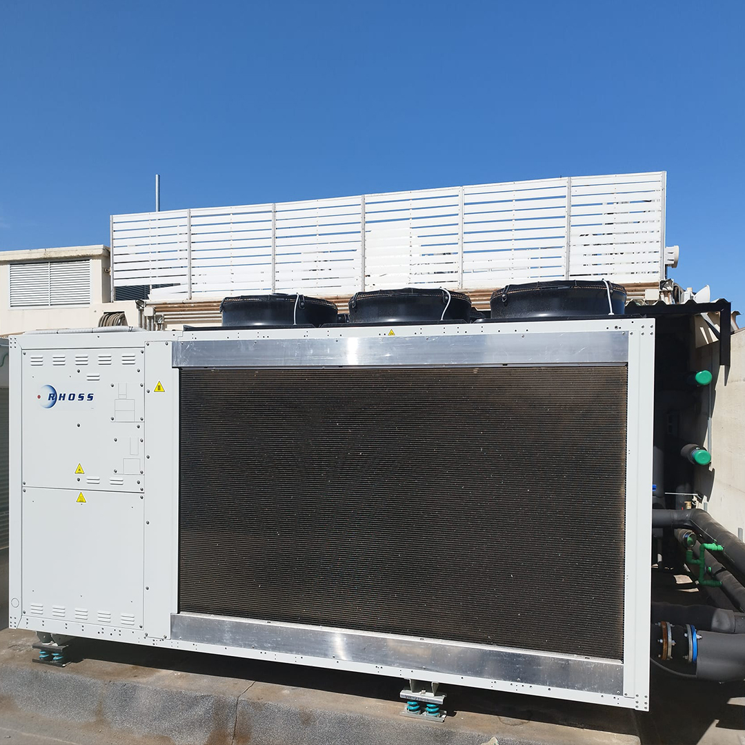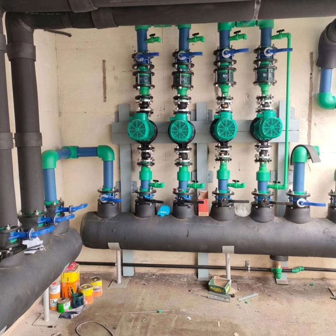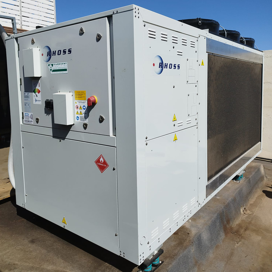 Montaje de sala de máquinas para enfriadoras de 131 Kw. Instalación provista de Kit hidrónico y depósitos de inercia.